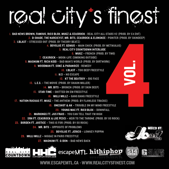 EscapeMTL.ca & RealCitysFinest.com present Real City’s Finest Volume 4. The latest installment includes brand new music from Montreal’s top talents including I.Blast, Magnum, Mugz, The Narcicyst, Milli Millz, Mr. Bits, CeasRock, Borden and more.